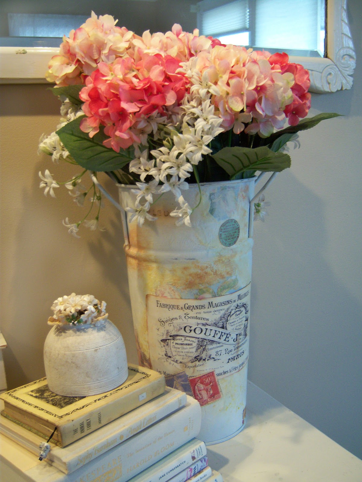 I repainted and embellished a tall (17") French flower bucket and put these flowers in for Summer. Pretty soon it will hold pink silk poinsettias for Christmas. Yes, pink; that's what bliss means to me.